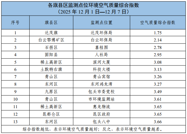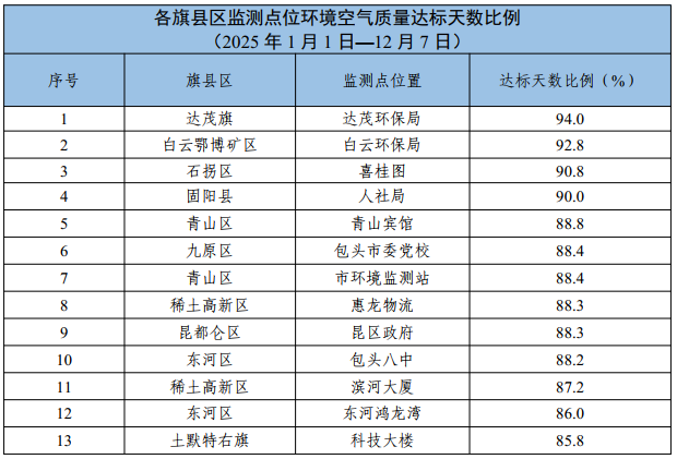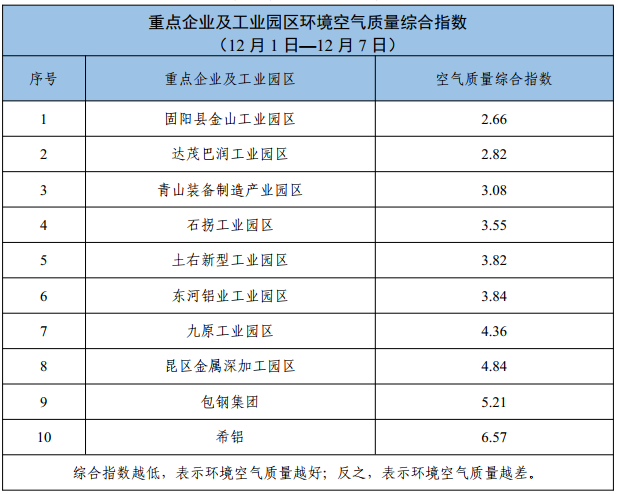 包头市各旗县区、重点企业及工业园区环境空气质量公示(2025年1月1日—2025年12月7日)