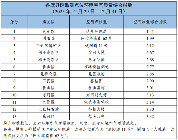 包头市各旗县区监测点位环境空气质量公示