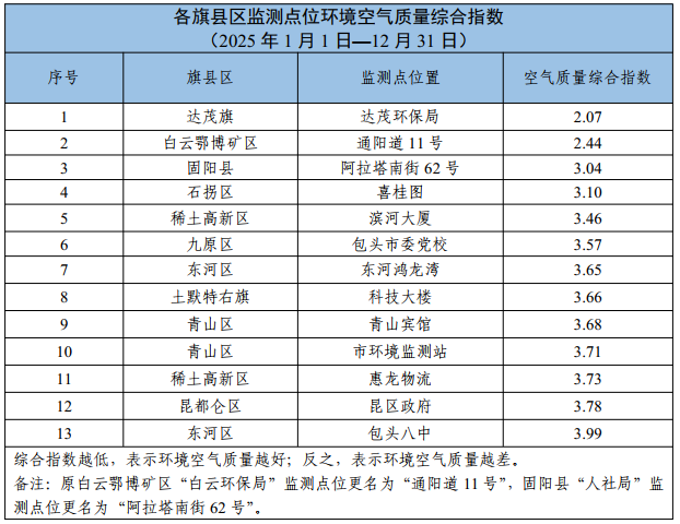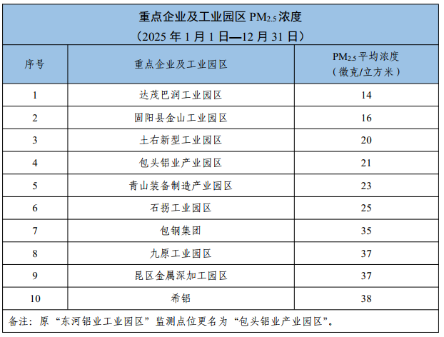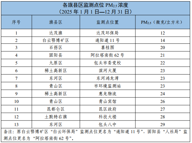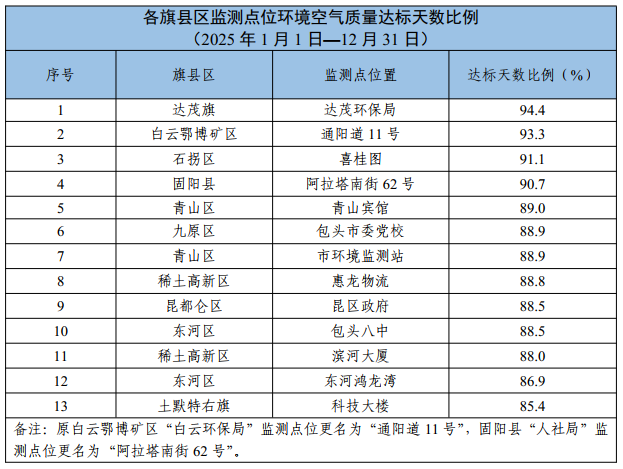 包头市各旗县区、重点企业及工业园区环境空气质量公示(2025年1月1日—2025年12月31日)