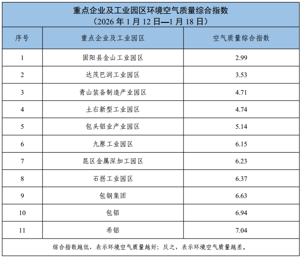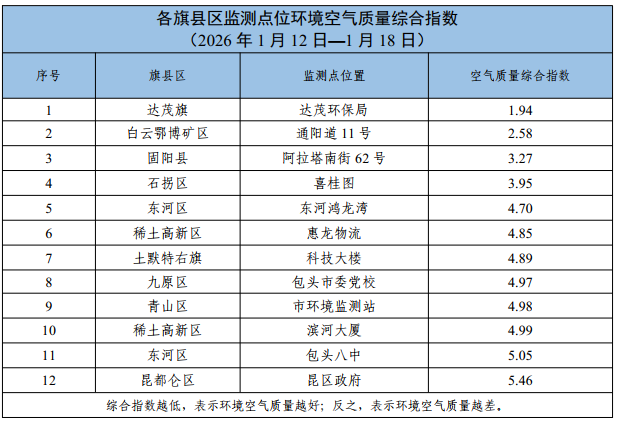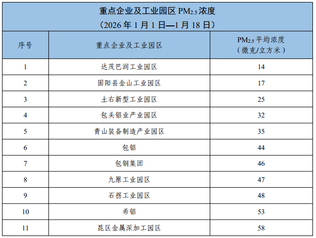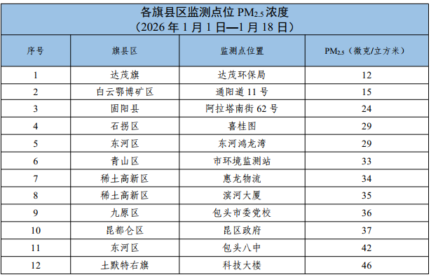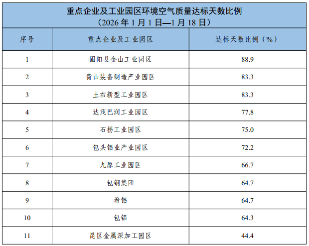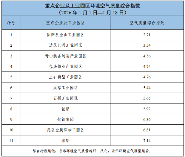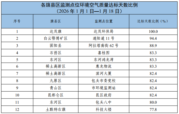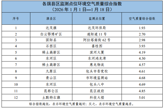 包头市各旗县区、重点企业及工业园区环境空气质量公示(2026年1月1日—2026年1月18日)