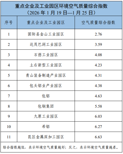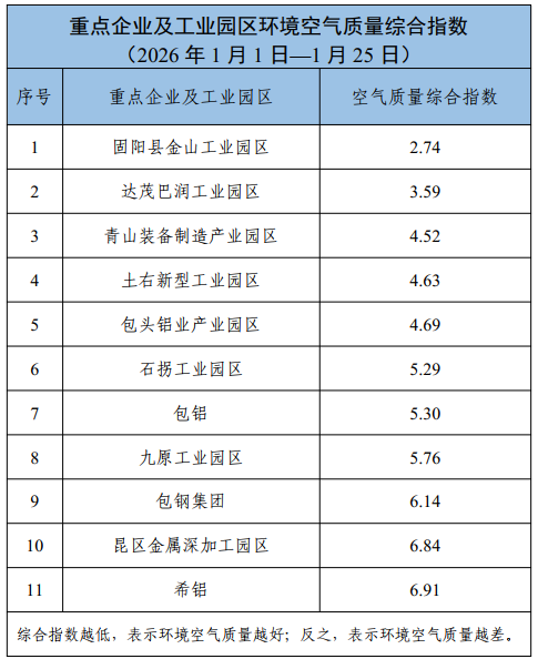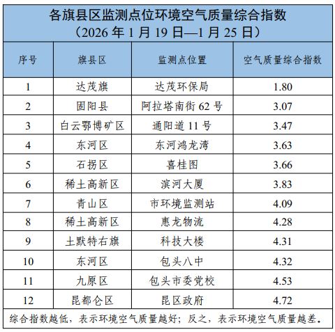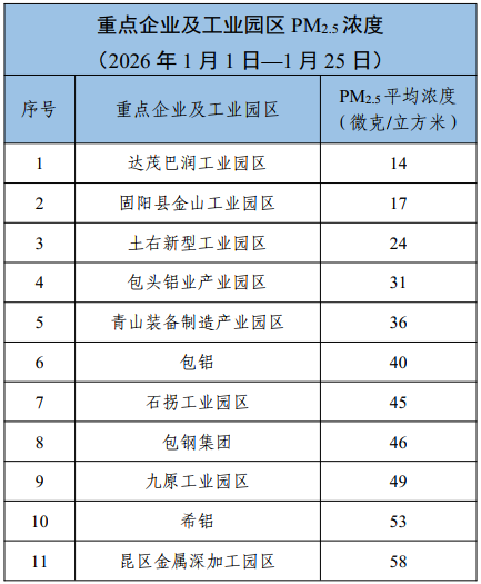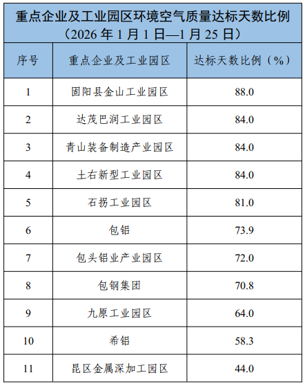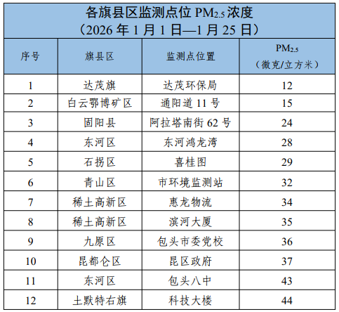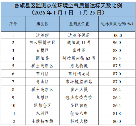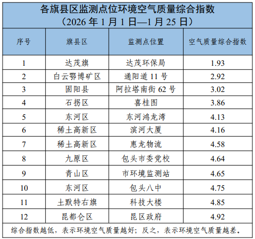 包头市各旗县区、重点企业及工业园区环境空气质量公示(2026年1月1日—2026年1月25日)