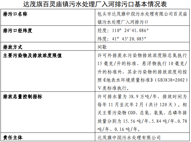 根据《中华人民共和国水污染防治法》《入河排污口监督管理办法》(生态环境部第35号)等有关规定,经审核,现对达茂旗百灵庙镇污水处理厂入河排污口准予设置情况进行公示。公示期为2025年4月8日-2025年4月21日(十个工作日)。
