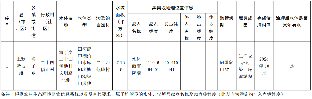 截止2024年10月,我市组织对本行政区域内农村黑臭水体进行治理,目前已完成治理国家监管清单黑臭水体1个,现将有关情况予以公示,接受公众监督。